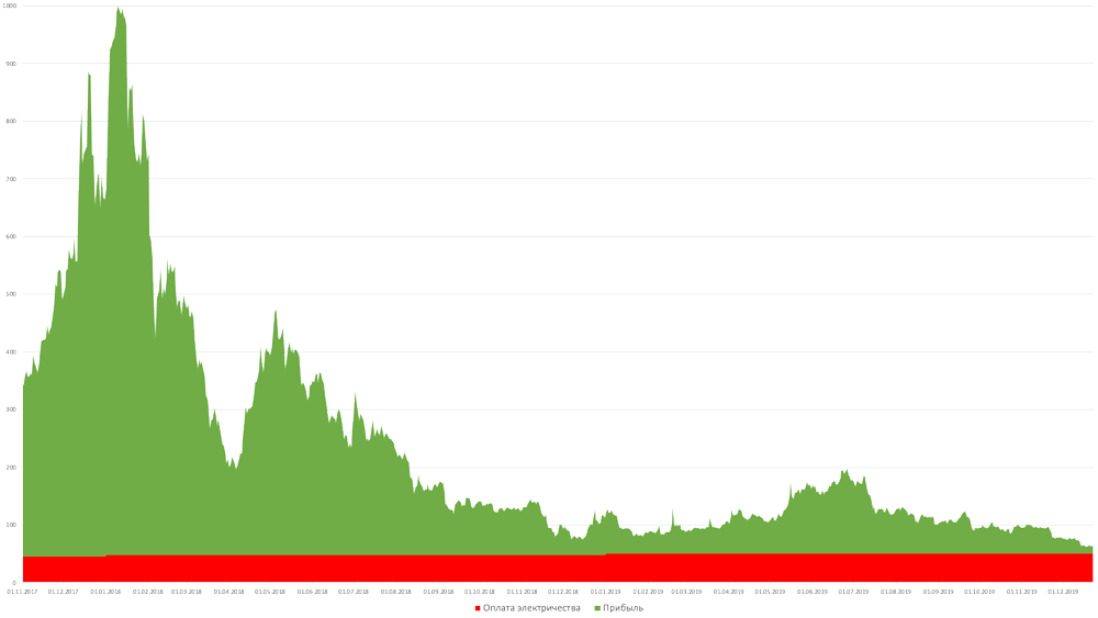 Свою ферму я собрала в ноябре 2017 года. После запуска фермы мой доход был около 400 рублей в день и постоянно рос. Достигнув, за пару месяцев, пиковой суммы в 1000 рублей в день. За первые 3 месяца добычи криптовалюты я окупила половину стоимости фермы. И надеялась через пару месяцев уже начать зарабатывать.