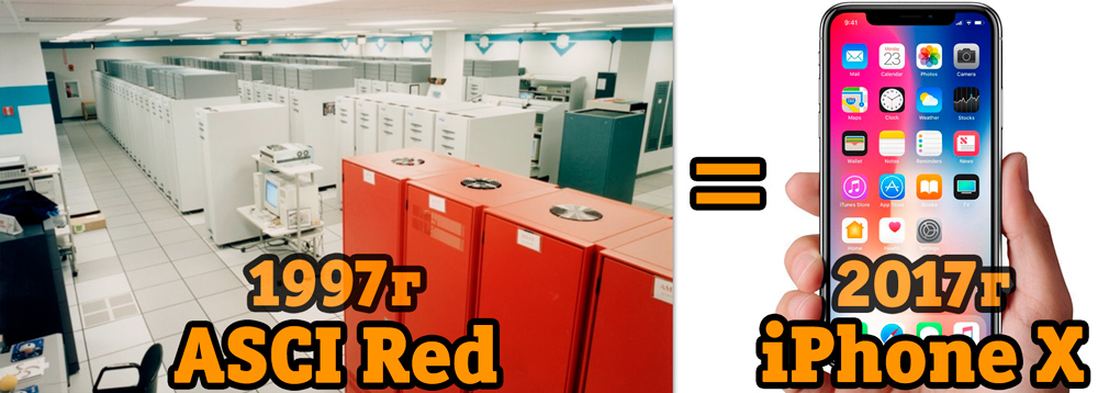 В 1997 году компания IBM создала суперкомпьютер ASCI Red, используемый правительством США для военных целей. Он был самым мощным суперкомпьютером в мире до 2000 года, занимал целый этаж, весил десятки тонн и потреблял электричества как целый район.