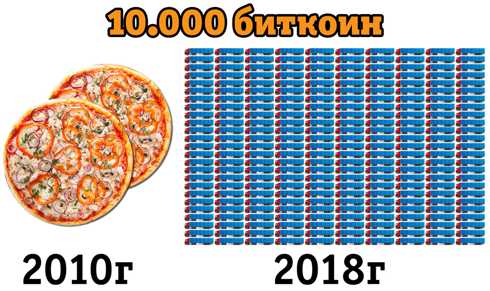 Выходом Биткоина в реальный мир и торговлю можно считать 2010 год, когда один американец за 10 тысяч биткоинов купил 2 пиццы. В 2018 году на эти биткоины, он мог-бы купить целый автопарк из 250 грузовиков, c 4 миллионами пицц. Эта покупка вошла в историю, как самая дорогая пицца в мире. Это еще раз показывает какими стремительными темпами врывается в нашу жизнь криптовалюта.