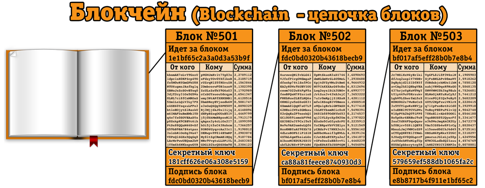 У каждого пользователя хранится база данных всех кошельков и переводов – которую можно представить как книгу. Тогда лист этой книги – это блок. У каждого блока есть свой номер, есть номер предыдущего блока, и есть уникальная подпись, которая подтверждает корректность данных. Поэтому каждый блок идет строго за предыдущем блоком, и получается неразрывная цепочка блоков.